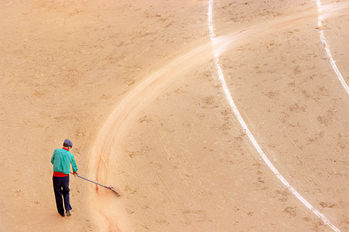 La cal blanca mancha la arena dando forma a los círculos del ruedo queriendo delimitar el espacio y el tiempo.